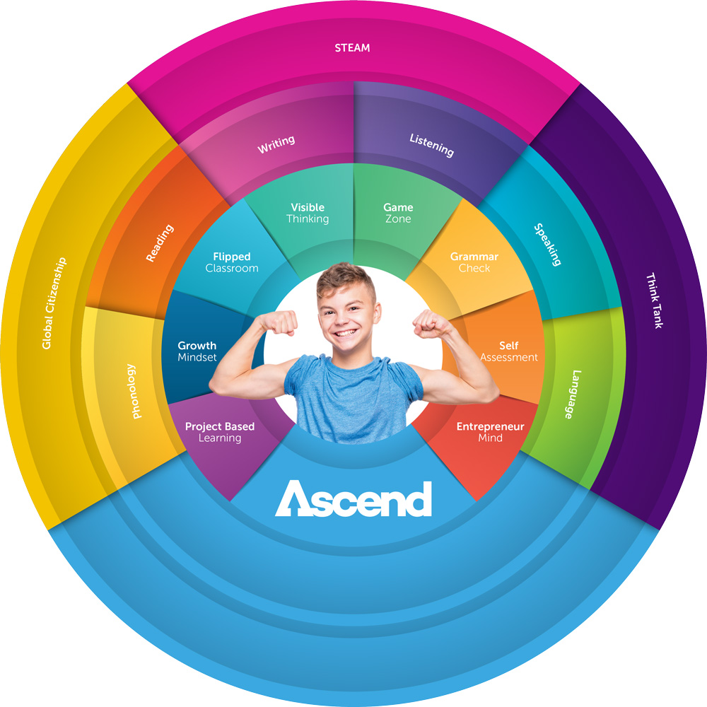 ASCEND está diseñado para colegios que tengan más de una sesión de inglés al día. Es la integración del programa LEAD más los tres módulos que veremos a continuación: